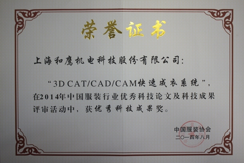 10月9日—10日,中国服装协会在江苏常熟召开2014服装行业科技成果交流会。上海和鹰机电科技股份有限公司受邀参加活动,公司的“3D CAT/CAD/CAM快速成衣系统”获得协会颁发的“优秀科技成果奖”副总裁凌军先生代表公司领取奖状。