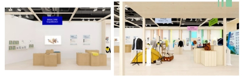展位整个区域以可持续理念设计搭建,展示道具采用了纺织服装工厂废弃的面料、纱线纸管,以及回收衣服制作的板材搭建,希望以废物再利用的形式唤醒大众的环保理念。