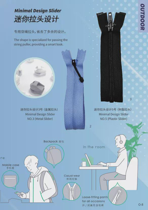 03 OUTDOOR 户外生活 专为户外服饰而生 适用极限户外活动场景 推荐产品: QuickFree®简单插入·简易分离拉链 树脂纤细拉链 迷你拉头设计 AquaGuard®防泼水拉链/AQUASEAL?专业防水拉链 ADVANCEN®树脂四合扣/橡胶手感漆宽边气眼#500/#700