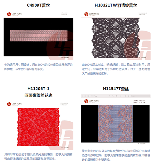 本季联丰纺织主打四面弹蕾丝、雪尼尔纱蕾丝、羽毛纱蕾丝、环保蕾丝,其中,四款首发新品将为内衣及时装设计提供更多灵感。