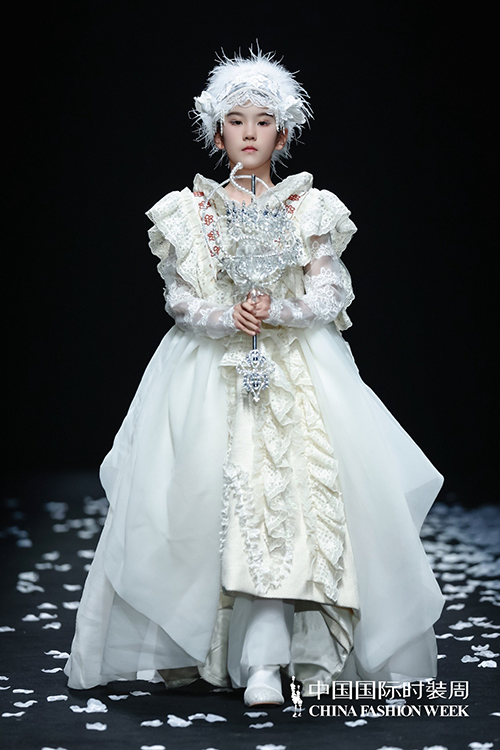 ![]() 开场男孩【王圣睿】身着乙仙主题定制礼服,设计师历时2680个小时手工珠绣的高定创意礼服“无相之色·霜白”开篇出场,稳健的台步颇具守护神之风、将男孩的勇敢、坚强、坚定的力量展现得淋漓尽致。