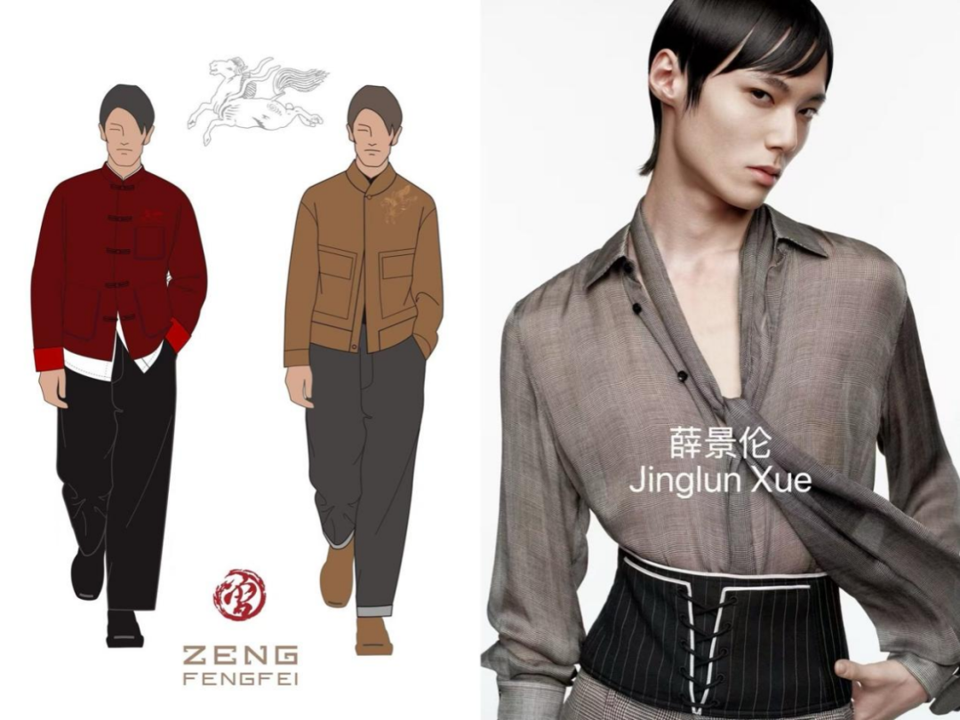 ![]() ![]() ![]() 大秀开场,首套丙午系列高定男装,由曾凤飞品牌设计、定制,作品甄选桐昆丝绒面料,将丙午马年元素与非遗割绒工艺相融,尽显新中装时代风骨。同时,特邀近几季活跃在巴黎、米兰国际时装周的超模薛景伦开场演绎。设计师与超模以各自的艺术语言,完成了对纤维面料的时尚表达。