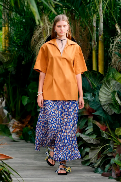 上起:KENZO、JASON WU、KENZO、TOD'S 关键面料 超轻超薄面料展现多样化外观,色彩柔和的浪漫薄纱带来哑光的质感表面,磨砂效果的印花尼龙极具轻量化;细密丝绸及棉质面料以光泽表面呈现;机能针织诠释时尚修身款式。 关键风格和单品运用 俏皮的造型设计展现了少女向往的活泼与梦幻。超大功能性贴兜设计碰撞极具女性特质的纱裙式阔腿裤,箱型的棉质衬衫关注领部设计,相同的印花图案为内外叠穿造型带来视觉的统一。