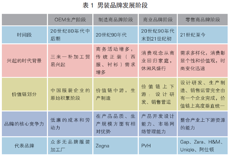 服装品牌的发展有其共同的规律,不论是意大利、美国,还是法国品牌。从服装行业上中下游价值链划分的角度来看,中国男装的品牌发展经历了这样几个阶段:OEM生产阶段、制造商品牌阶段、商业品牌阶段和零售商品牌阶段。