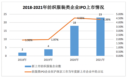 纺织工业作为我国重要民生产业,这一年来在加速产融合作、扶持和加快推进纺织服装类企业进入国内各级金融市场广泛吸纳社会资金、提升企业形象和行业影响力等方面取得很大进步。据统计,2021全年共有23家纺织服装类企业在沪深京三市成功上市,是三十年来纺织服装类企业上市数量最多、数量增速最大的一年。全年纺织服装类新上市企业数比上年增长了27.78%,纺织服装类新上市企业在沪深京三市新上市企业总数占比为4.39%,比上年度降低了0.16个百分点;2021年度纺织服装类企业在沪深京三市IPO首发募资额达154.29亿元,占A股全年IPO募资金额的2.90%(比上年度占比4.15%减少了1.25个百分点)。