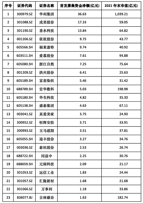 从全年新上市的26家纺织服装类企业首发募资规模看,华利集团(300979.SZ)、戎美股份(301088.SZ)、善水科技(301190.SZ)位列前三,首发募资超过10亿元的有3家纺织服装类企业。这三家企业首发募资额(67.80亿元)占比达到了43.94%。