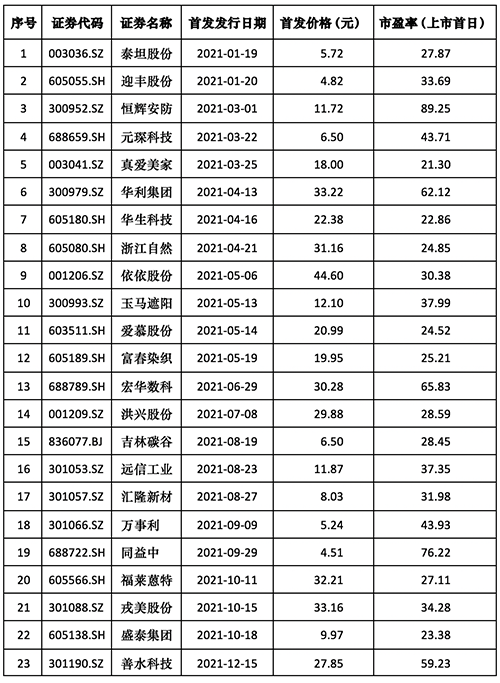 2021年度纺织服装类新上市企业首发上市市场反应与表现(附表2)
