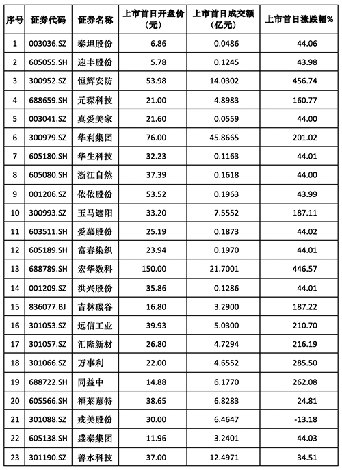 2021年度纺织服装类新上市23家企业在首发上市日的市场反应和整体表现是非常不错的。从相关资料统计情况看,上市首日市场平均估值(市盈率)39.13,中位数31.98。从二级市场直接反映出来的估值看,科技含量高应用广泛或附加价值高的产业用纺织品类企业普遍被市场追捧;上市首日开盘股价相比发行价涨幅表现优异,(增幅)平均值达82.07%;上市首日成交总额144.90亿元;上市首日平均涨幅126.78%,有10家首日涨幅超过100%,恒辉安防(300952.SZ)、宏华数科(688789.SH)和万事利(301066.SZ)分别以456.74%、446.57%和285.50%的涨幅位列前三。