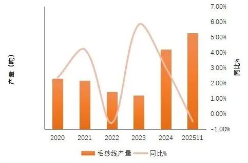 2025年,毛纺行业生产结构继续分化,主要产品产量随市场需求调整呈现差异化变化,产品结构在创新驱动下加速向高端化、功能化、绿色化升级。从产量变化来看,毛纱线与毛织物作为主要产品,2025年,毛纱线产量同比增长0.2%,毛织物同比下跌10.7%,跌幅较上半年收窄8.9个百分点。今年以来,毛纺行业的生产随着国际贸易氛围的波动而波动在内外市场的双重压力下,企业积极应对,寻求触底恢复。