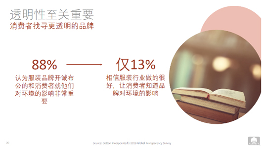 根据美国棉花公司2019全球透明性调查,88%的中国消费者认为服装品牌开诚布公的和消费者就他们对环境的影响非常重要,仅13%的消费者相信服装行业做的很好,让消费者知道品牌对环境的影响。消费者找寻更透明的品牌,消费者很有兴趣知道,产品如何制造(66%),生产对环境的影响(62%),产品制造商的可持续倡议(61%),产品产地(57%),如何回收或再使用产品(55%)。关于产品回收,自2006年起,美国棉花公司发起BLUE JEANS GO GREEN?项目,通过该项目收集牛仔布,将其从垃圾填埋场转移,并与Bonded Logic,Inc.合作,将其回收为UltraTouch?牛仔绝缘材料。每年,这些绝缘材料被分发到美国各地以帮助建筑工作。至今,已经收集了近250万条牛仔裤,从垃圾填埋场转移了超过1230吨纺织废品。