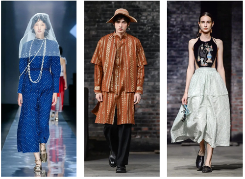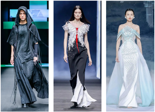 本季时装周上,中国美学、非遗创新成为多数品牌首选基调。众多设计奖良渚文化、三星堆文化、五行文化、山海经、古典诗词、古典戏剧、书法绘画等进行了艺术化、潮流化融合创新表达。本季涉及的非遗工艺包括京绣、苏绣、丝绫堆绣、潮绣、打籽绣、苗绣、缂丝、香云纱等数十种非遗工艺,展现出与现代潮流、生活方式接轨的新风貌。