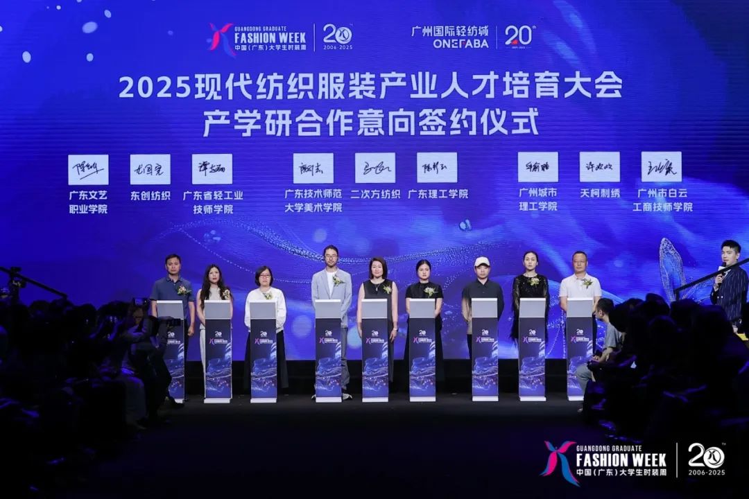 20年来,中国(广东)大学生时装周始终肩负起“人才孵化器”和“产业引擎”的双重使命,累计吸引国内外55所高校参与,为产业输送专业人才超20万名,链接纺织服装企业超20万家,促成产学研合作项目超1000项,间接带动产值增长超百亿元。这正是“百万英才汇南粤行动计划”在时尚产业领域的生动实践,通过政策赋能与产业生态吸引,让海珠成为粤港澳大湾区时尚人才的强磁场。从最初的毕业作品展演,到如今涵盖趋势发布、设计竞赛、产业对接的多元生态,大学生时装周已成为链接院校教育与企业需求的关键纽带,以海珠中大纺织商圈为原点辐射的粤港澳大湾区更成为了中国时尚新锐力量茁壮成长的理想沃土。从稚嫩到成熟,从探索到引领,这座天桥见证了无数梦想的萌芽与绽放,也托举起了中国纺织服装产业的未来与希望!