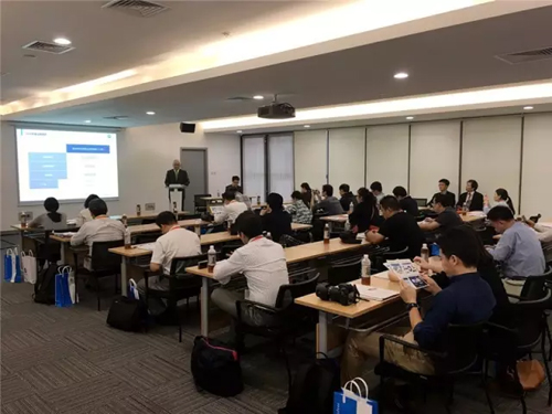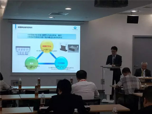 柯尼卡美能达新闻发布会会场全景。 10月21日,柯尼卡美能达株式会社(以下简称“柯尼卡美能达”)在国家会展中心(上海)举办的2016中国国际纺织机械展览会暨ITMA亚洲展览会上举行了新闻发布会,柯尼卡美能达株式会社常务执行役兼柯尼卡美能达(中国)投资有限公司董事长家氏信康等高管向来场嘉宾介绍了柯尼卡美能达的企业概况和发展愿景,柯尼卡美能达株式会社集团业务执行役喷墨事业部长小松克明介绍了喷墨事业的最新改善活动及其优越性。