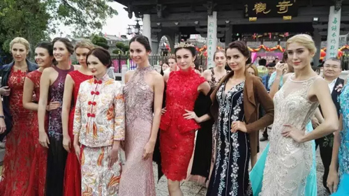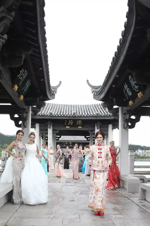 随后,在水墨画般的广济桥美景映衬下,19位外国模特惊艳登场。她们分别身穿参加本次婚纱礼服周的19家品牌的代表之作,婀娜多姿地漫步在古色古香的景致之中,将穿越时光的经典之美诠释得淋漓尽致。走秀之后,模特更身穿华服走过广济桥,与来宾一同品味唯美。