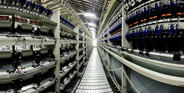 全球首条万吨级熔体直纺中试基地 当时,国内同行生产的超细纤维规格以0.5dpf(1万米重量0.5克)为主,而一家日本企业率先将超细纤维单丝细度做到了0.3dpf,并自信地宣称:这是世界上工业化纺丝的极限。“要做就要比别人做得更好,走差异化发展之路。”涉足化纤行业不久的盛虹集团毅然出资7亿元,在欧洲成立研发中心,并联合清华大学、东华大学专家攻关。 化纤厂区自动化生产车间,机械臂在搬运丝饼 “当时我们把印染业务赚的钱预研化纤新产品,很多人不理解。”缪汉根笑着说。在他的激励下,企业研发人员顶住压力潜心攻关。历时两年多、经过无数次失败后,盛虹集团终于成功攻克0.15dpf的“世界极限”,用这种超细丝绕地球一圈共4万公里只要一斤二两。与此同时,研发人员在设备、工艺上同步研发,0.15dpf超细纤维单丝很快实现量产,并迅速进入了国内外市场。如今,盛虹的超细纤维年产量,已超过欧美日韩等国家和地区的总和,位居全球第一。