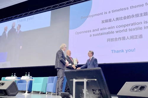 ![]() 今年年会新增了“国际纺联奖项”颁奖环节。由东华大学和凯赛生物科技股份有限公司共同开展的项目——生物基聚酰胺56产业成套技术开发,获得国际纺联创新和可持续奖;由中国纺联等9家行业组织共同搭建的平台——STAR NETWORK,以及由上海元彩科技有限公司开发的合作项目——Coloro,获得国际纺联国际合作奖。