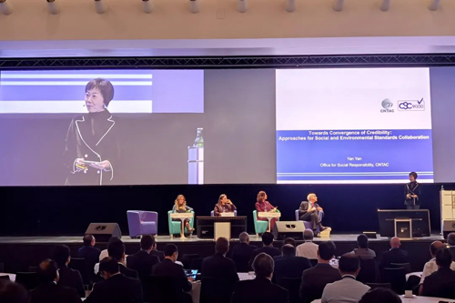 ![]() 在“社会环境标准”议题环节,中国纺联社会责任办公室主任阎岩以“融合发展:社会和环境标准合作的途径”为题,进行了发言。关于开发和实施自愿性可持续性标准(VSS),她呼吁,一是要提高标准制定过程中利益相关者的透明度和参与度;二是要加强VSS应用程序的能力建设;三是要与市场机制相结合,向在应用VSS方面表现良好的企业提供商业发展的鼓励支持。