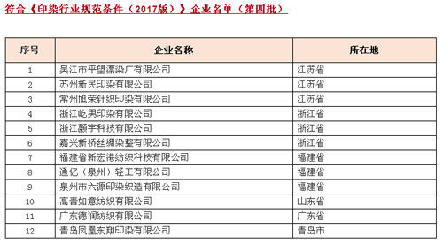 经企业自主申报、省级工业和信息化主管部门核实推荐、专家组评审及现场复核、征求生态环境部意见、对外公示等程序,现将符合《印染行业规范条件(2017版)》企业名单(第四批)予以公告。