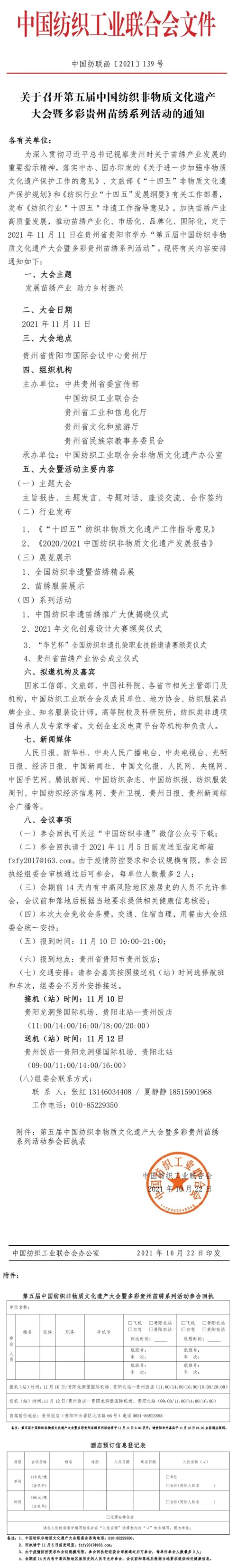 为深入贯彻习近平总书记视察贵州时关于苗绣产业发展的重要指示精神,落实中办、国办印发的《关于进一步加强非物质文化遗产保护工作的意见》、文旅部《“十四五”非物质文化遗产保护规划》和《纺织行业“十四五”发展纲要》有关工作部署,发布《纺织行业"十四五"非遗工作指导意见》,加快苗绣产业高质量发展,推动苗绣产业化、市场化、品牌化、国际化,定于2021年11月11日在贵州省贵阳市举办“第五届中国纺织非物质文化遗产大会暨多彩贵州苗绣系列活动”。