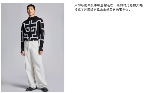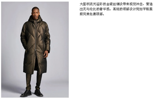 ![]() 奢华感压轴:高端质感与格调永续。从浅金色向黑金过渡,金色松针图案,白绒金丝松针面料以及黑银羽绒服切割感,逐渐递进,黑金搭配作为压轴出场,带来流光溢彩的大面积视觉冲击。