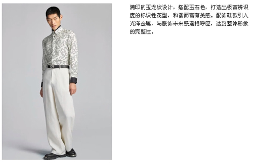 ![]() 玉龙纹花型:现代化图腾彰显东方美学神韵。KB HONG以独特的东方气韵彰显未来时装的魅力,其中全新花型玉龙纹是本季最大亮点之一。抽象又具现代美感的玉龙纹花型,温润而谦和的玉石色,背后传递出KB HONG对儒雅内敛、刚劲有力的中国男性的赞誉。