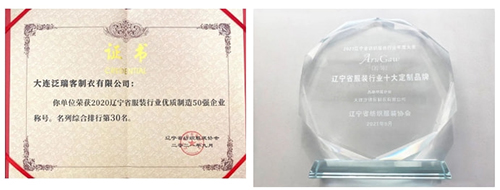![]() 值得一提的是,2021年,初雪梅入选了2021中国纺织服装行业十大年度人物;泛瑞客荣获2020年辽宁省服装行业优质制造50强企业称号,名列综合排行第30名;旗下品牌AruGaw诺尜在2021辽宁省纺织服装行业年度大奖评选中,荣获辽宁省服装行业十大定制品牌。