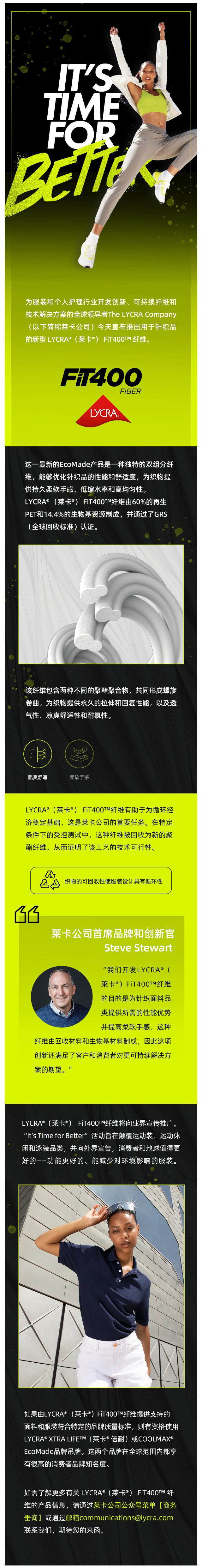 莱卡公司推出新型 LYCRA®(莱卡®) FiT400™ 纤维