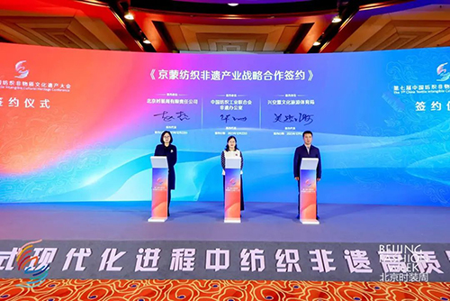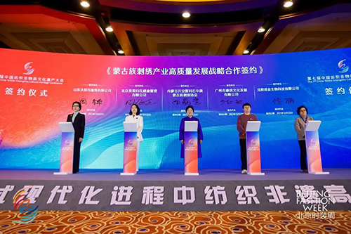 ![]() 中国纺联产业部主任华珊、北京时装周有限责任公司总经理赵哲、兴安盟文化旅游体育局党组成员、副局长关忠海就京蒙纺织非遗产业战略合作签约。