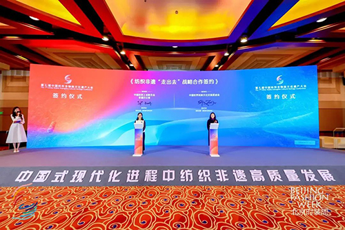 ![]() 中国纺联产业部主任华珊、中国世界民族文化交流促进会副会长兼秘书长邱丽就纺织非遗“走出去”战略合作签约。