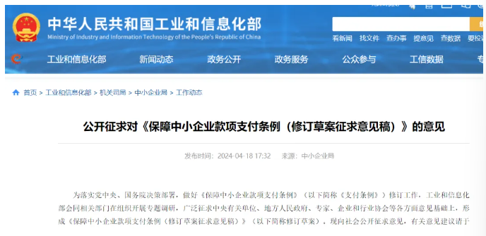 近年来,受国内外复杂经济形势影响,中小企业应收账款规模增长、账期拉长,“连环欠”现象较为突出。为了促进机关、事业单位和大型企业及时支付中小企业款项,维护中小企业合法权益,优化营商环境,工业和信息化部近日公开征求对《保障中小企业款项支付条例(修订草案征求意见稿)》的意见。