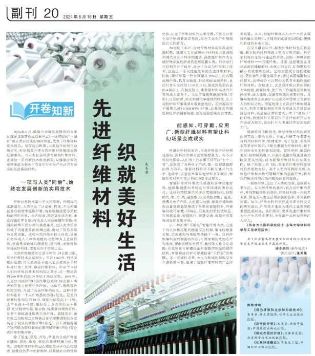 8月16日出版的《人民日报》副刊刊登中国科学院院士、东华大学材料科学与工程学院院长朱美芳署名文章《先进纤维材料 织就美好生活》。全文如下: