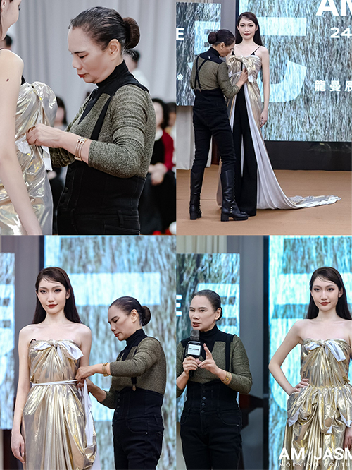![]() 本次活动最精彩的瞬间不止于新品发布,节目最后展示了一场关于即兴创作礼服的时尚扎装表演。,“中国模特之母”国际模特评委苏莎老师和龍曼辰品牌设计师梁晨分别使用不同的布料进行扎装创作,展现她们对时尚的独特理解。