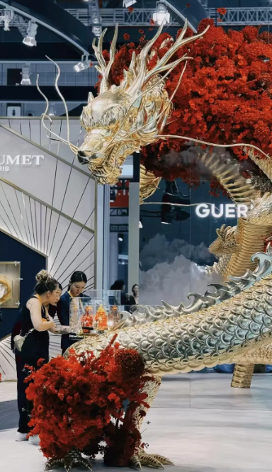 时值中法建交60周年,LVMH路威酩轩集团携旗下4大业务领域、14家极具代表性的品牌,连续第5年参加进博会,分别在6.2馆和5.2馆设立双展台,共庆中法深厚情谊。其中,位于6.2馆LVMH集团展台以600平方米精品空间,一展法式园林与建筑风格美感,展区内的霸气金龙更是吸引了无数参观者打卡拍照。