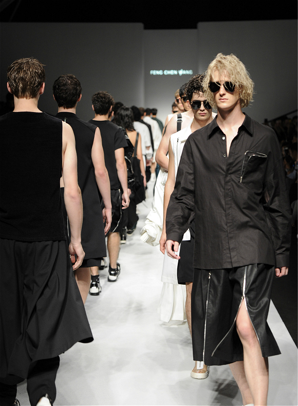 开场视频结束后,在用强烈鼓点象征心跳声的音乐,以及昏暗灯光交互出的神秘气氛中,9个男模步出T台排成一列,男装品牌FENG CHEN WANG在上海时装周的2016春夏秀正式开始。模特的头发被打理成沐浴后沾湿的效果,身上细细地喷上了水珠,看得出这是一场精心筹备和对细节严格把控的时装秀。