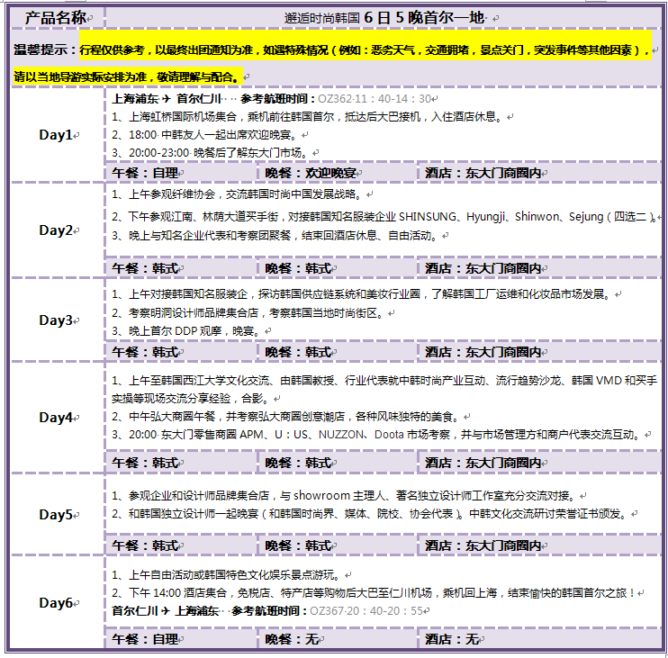 以上行程可根据实际情况对顺序作出调整,不足15人不成团! 报价包含: 1.全程国际机票费用、燃油附加税; 2.全程韩国当地酒店标准间住宿; 3.全程旅游巴士(含保险); 4.全程中文翻译、WIFI; 5.韩国资深买手、时尚导游、行业代表全程指导互动; 6.酒店内自助早餐,行程中所列的午晚正餐; 7.境外旅游人身伤害意外险; 8.中韩文化交流荣誉书授予。 报价不含: 1.个人护照办理费用、签证费用; 2.航空保险费、行李保险费、超重行李费; 3.酒店客房、行李员、餐馆等其它自愿支付小费; 4.各项私人额外费用如:洗衣、长途电话、酒水等消费; 5.行程外任何观光项目及自费活动(包括这些活动期间的用车、导游和司机服务等费用); 6.单人间房差:400元/人/晚*5晚; 7.因私人原因、交通延阻、罢工、台风或其它不可抗力因素而产生的额外费用。 |