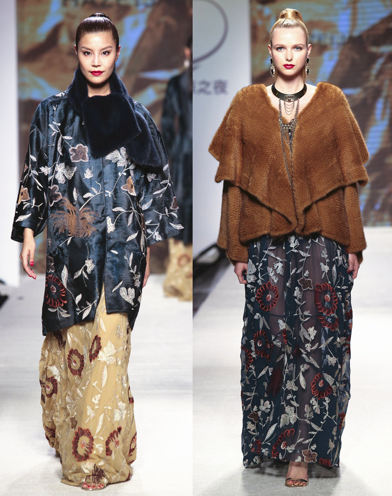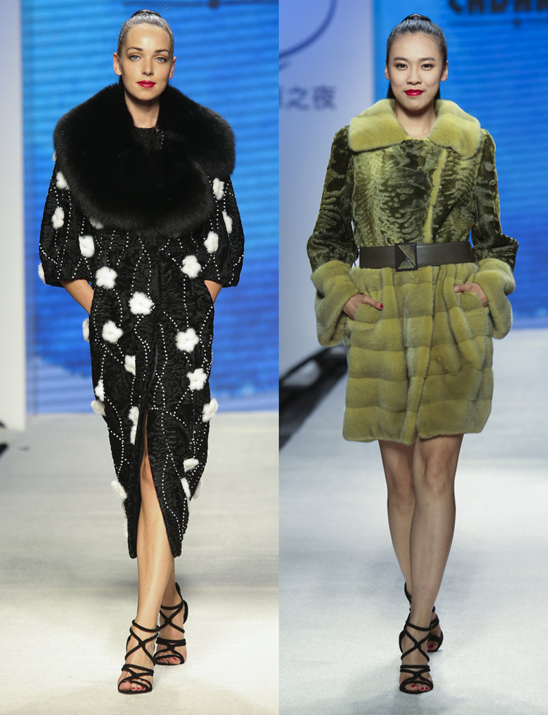 由水貂和羔羊皮剪裁而成的典雅黑色和嫩绿系列高贵的外套和大褛缀以细致的线条,营造出美丽的图案,再加上以水貂制成的白色花形贴饰,令视觉效果更加丰富多采。