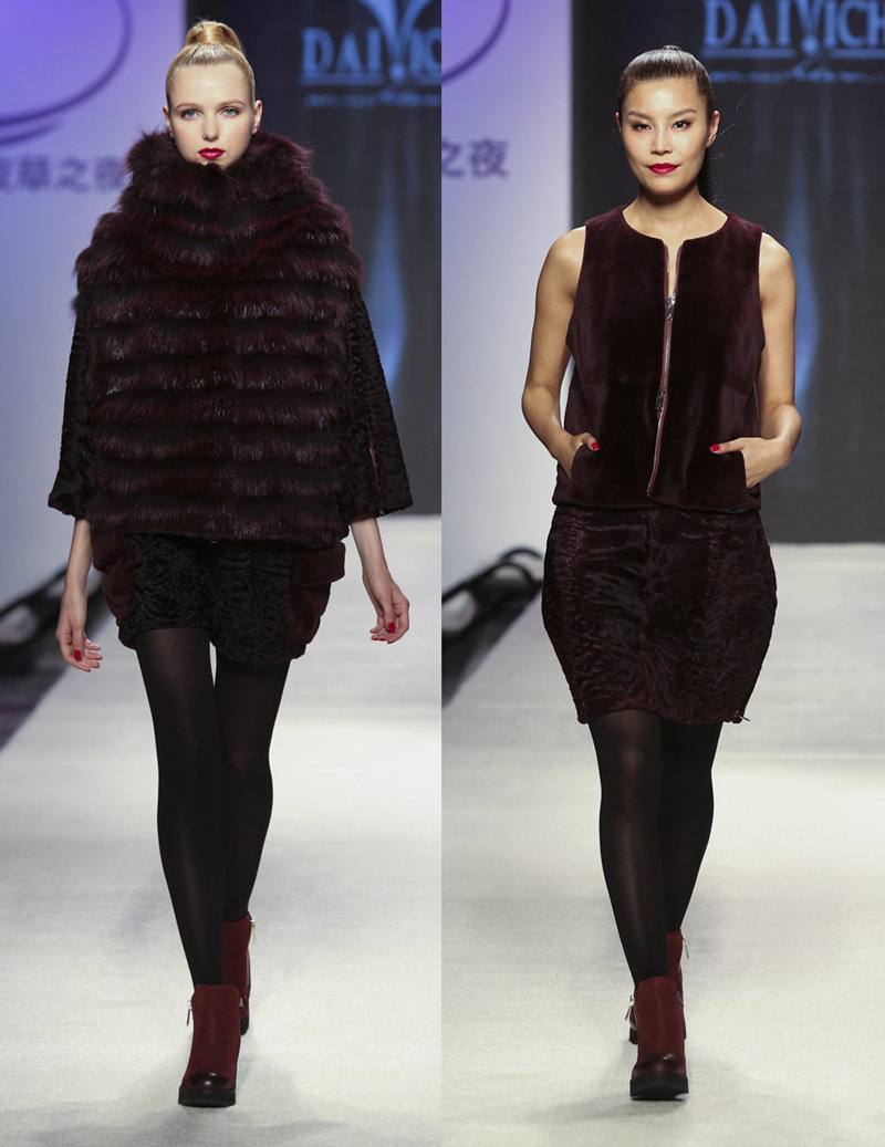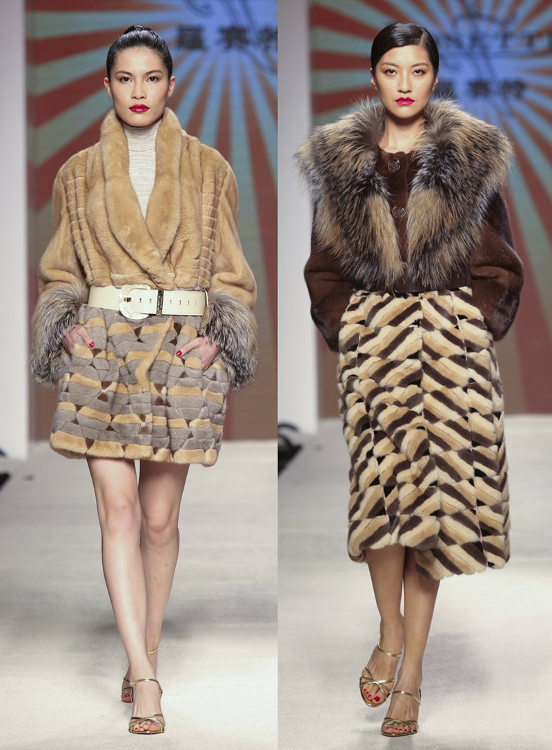 不同长度的时髦束腰外褛、大披肩和背心裙由米、啡和紫色系的水貂、冰岛大理石狐和羔羊皮剪裁而成。条纹对比、圆形或菱形拼贴图案设计让这件皮草活泼灵动;鳗鱼皮制造成的皮带、衫身和修饰细节则使造型更时尚。