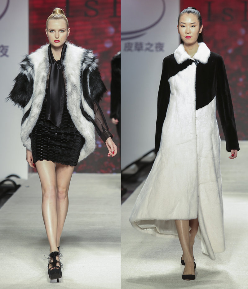 青春和前卫的黑白色系列–设计轻巧的剪毛和长毛水貂伞型设计,用蛇皮的质感来突显重点细节。设计师选用冰岛大理石狐和银狐材质,不论是作为服装主面料或是点缀襟幅和下摆边缘、都诠释着另类的时尚。