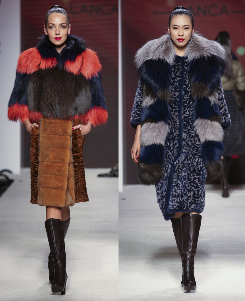 以线条和几何形状为主设计的是这系列剪毛水貂和狐毛系列的亮点,并以束腰设计来强化修长剪裁。颜色由浅至深,在白、米色至深沉的巧克力啡和蓝色的变化中,各种条纹、圆与对角图案和谐融合,突显出艺术与时尚交融的设计感。