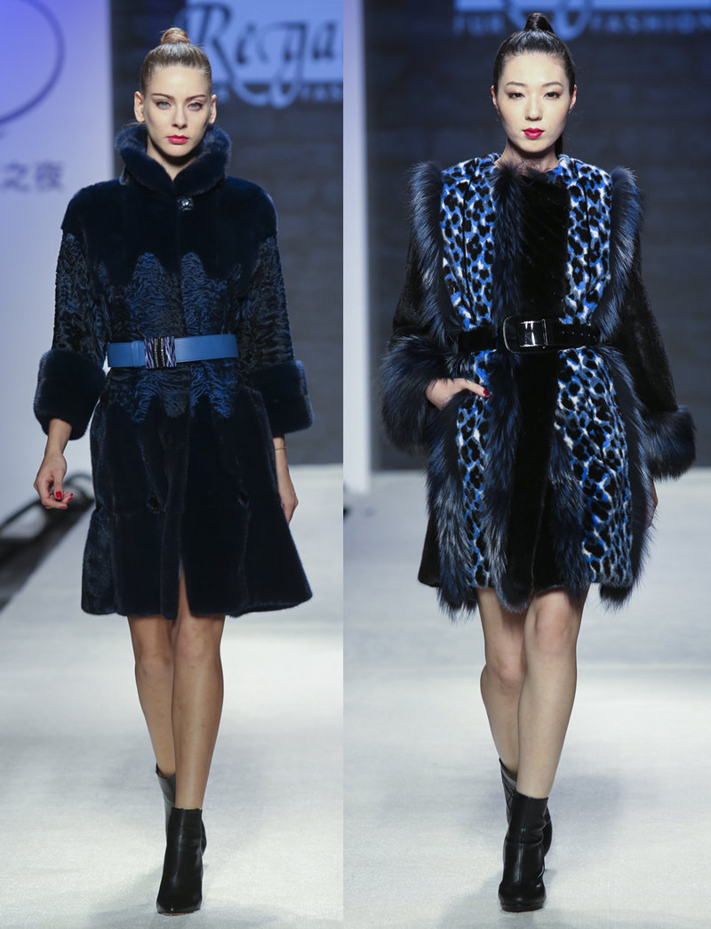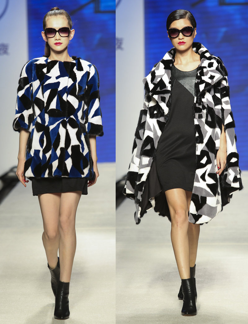 一系列外套以染黑、白和彩蓝色的印花图案为主题,由水貂、狐毛、皮革和羔羊皮拼凑成线条简洁的设计。运用黑色与印花图案相间组成,更显修身效果。