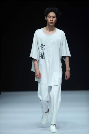 看点三 SIVICO·乔丹:女王来巡山,“你猜”怎么样? 一夜之间,我们彻底记住了一个深黑大眼线、高耸丸子头、黑色战袍的女设计师:乔丹。她用实际行动告诉我们三件事儿:男色时代早已来临,不基腐无市场;衣着本不分性别,颜色也是;秀,是任性的。 SIVICO·乔丹这一系列的男装主题是“你猜”。灵感来源于“你猜、你猜我猜不猜、你猜我猜你猜不猜”这一循环句式流行语。在小编看来,这句话的意思充满调侃甚至戏谑:我任性,这就是我。