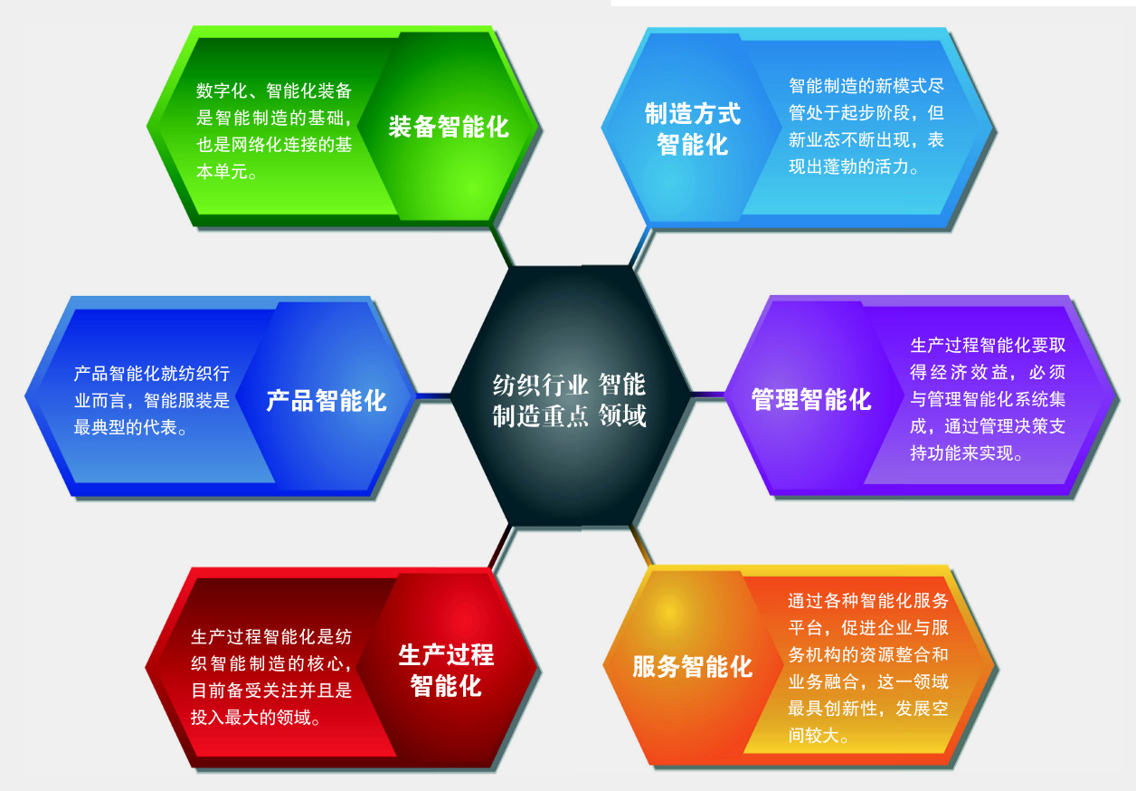 在多年来推进两化融合的过程中,纺织工业面临诸多未能根本解决的困难和问题,如生产制造环节的数字化、智能化一直是个难点,亟待有所突破。智能制造及其一系列新技术的开发和应用,势必给解决这些问题带来新的思路和新的路径,突破某些关键环节的瓶颈,带动行业整体信息化水平的提升。工信部在2015年工作计划中,对传统行业给予了关注,明确选择钢铁、石化、纺织、轻工、电子信息等领域开展智能制造的应用示范,组织实施关键工序智能化工程。 鉴于纺织行业自身的特点,下面分几个方面对纺织智能制造的实施范围和领域、推进的路径和重点进行探讨和研究,主要分析不同领域在智能制造中的地位、重要性、现有基础和发展设想,以便采取有效的方式加以推进。