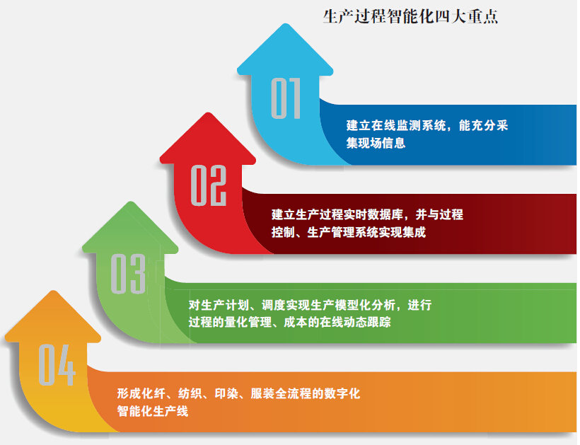 生产过程智能化是核心 经过几年来的努力,生产过程智能化在纺织工业的多个生产环节都取得了明显的进展和显著的成效。如经纬的E系统,覆盖了从开清棉到并条、粗纱、细纱、络筒的纺纱生产全过程;杭州开源的印染MES系统,对染色生产工艺在线检测、自动控制及自动配送进行全方位管理;山东康平纳的全自动筒子纱染色系统,实现了包括染料助剂自动配料和筒子纱自动输送,建成了自动化、连续化生产线;上海和鹰开发了从人体三维测量到服装CAD、三维虚拟试衣、自动剪裁、吊挂缝纫的服装全过程生产系统。 生产过程智能化系统,向下连接智能化设备,向上与管理智能化软件系统集成,并对智能化新模式新业态提供必不可少的支撑,处于整个智能制造的核心地位。下一步的发展方向包括:建立在线监测系统,能充分采集制造进度、现场操作、质量检验、设备状态等现场信息;建立生产过程实时数据库,并与过程控制、生产管理系统实现集成。很重要的是能够对生产计划、调度实现生产模型化分析,进行过程的量化管理,成本的在线动态跟踪。系统的目标是实现基础数据共享,工艺流程改造,实时在线优化,全面提升企业的生产资源优化配置水平。
